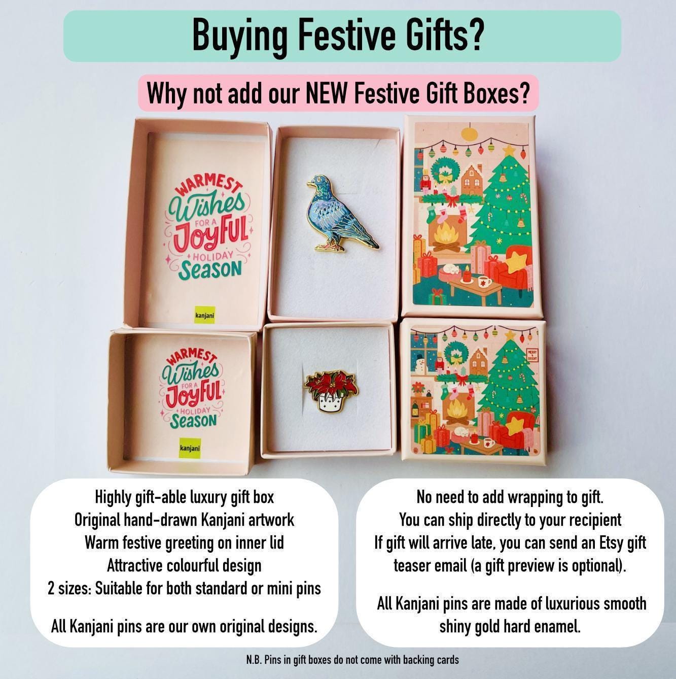 Diese goldene Kanjani-Anstecknadel aus Hartemaille ist Teil unserer neuen Ergänzungen 2025 zu unserer beliebten Anstecknadelserie „Beautiful Birds“, die die Schönheit und Eleganz der Vögel um uns herum und darüber hinaus feiert. Wie alle unsere Anstecknadeln haben wir diese selbst gezeichnet und entworfen, und deshalb kann man sie nirgendwo anders finden oder kaufen. Sie besteht aus goldener Hartemaille, hat an ihrer breitesten Stelle einen Durchmesser von 38 mm und hat auf der Rückseite eine Anstecknadel mit goldenem Militärverschluss*. Sie wird auf unserer eigenen Rückwandkarte im Kanjani-Design geliefert, die in Großbritannien bedruckt wurde. Alternativ können Sie sich für die Option einer robusten Kanjani-Geschenkbox entscheiden, in der Ihre Anstecknadel auf einem weichen schwarz-weißen Schaumstoffkissen (ohne Rückwandkarte) präsentiert wird und dies beinhaltet auch ein kostenloses Upgrade auf Anstecknadelrückseiten mit Verschluss. Geschenk sortiert: Auftrag erledigt. Es stehen verschiedene Farboptionen für die Geschenkbox zur Verfügung (siehe Foto). Wenn Sie möchten, dass ich 2 Anstecknadeln in einer einzigen Geschenkbox liefere, kaufen Sie bitte die große Geschenkbox (nur in Weiß erhältlich).